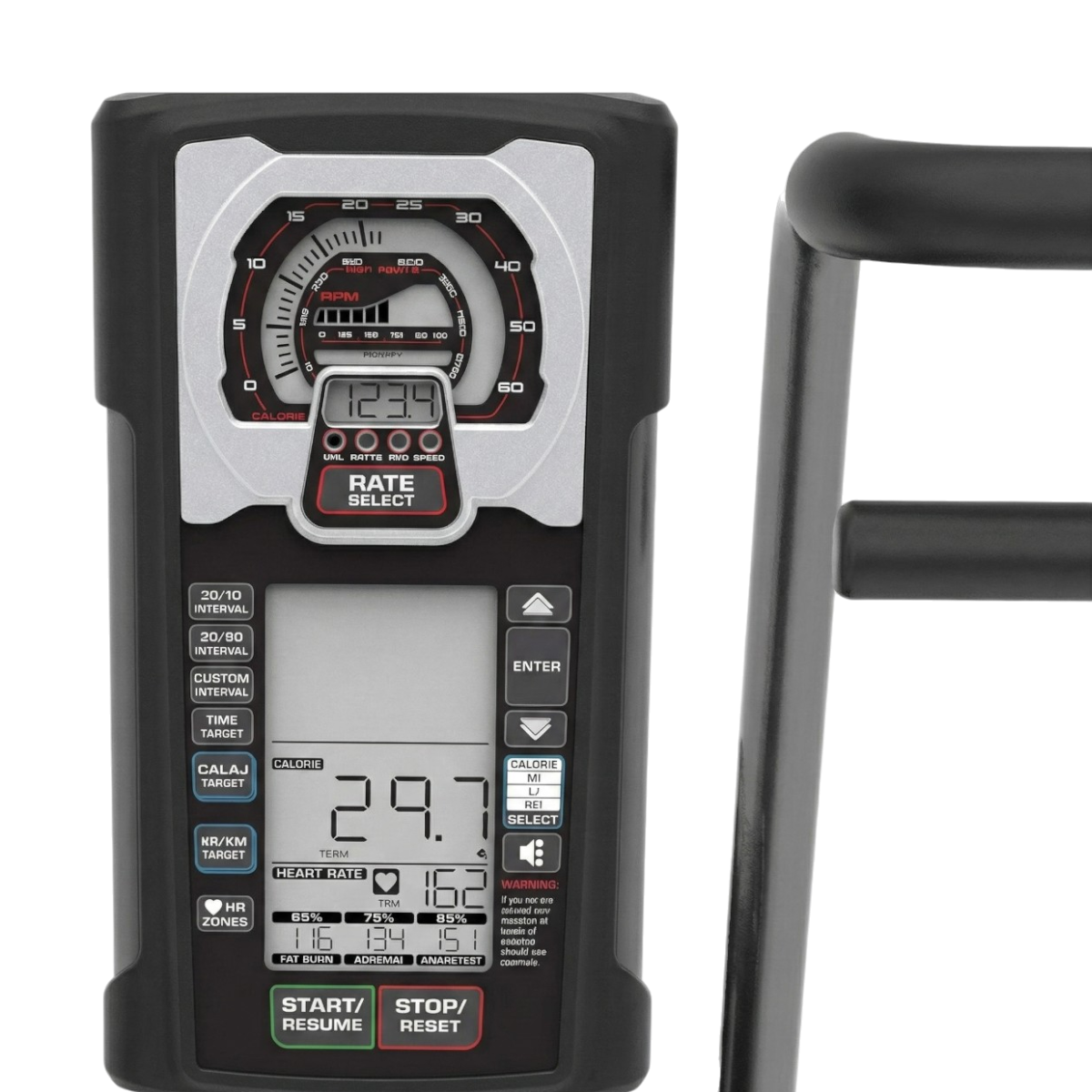 Keep your motivation high with the simple, intuitive digital display. The console features a visual Tachometer that signals exactly how hard you are exercising, fueling the compulsion to "bury the needle." With one-touch program buttons, users can instantly tackle HIIT routines like 20/10 or 30/90 Intervals, while tracking essential stats including Heart Rate (Polar wireless compatible), RPM, Distance, Watts, and Calories.